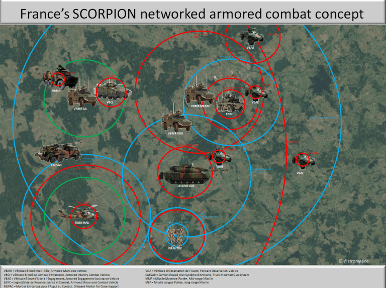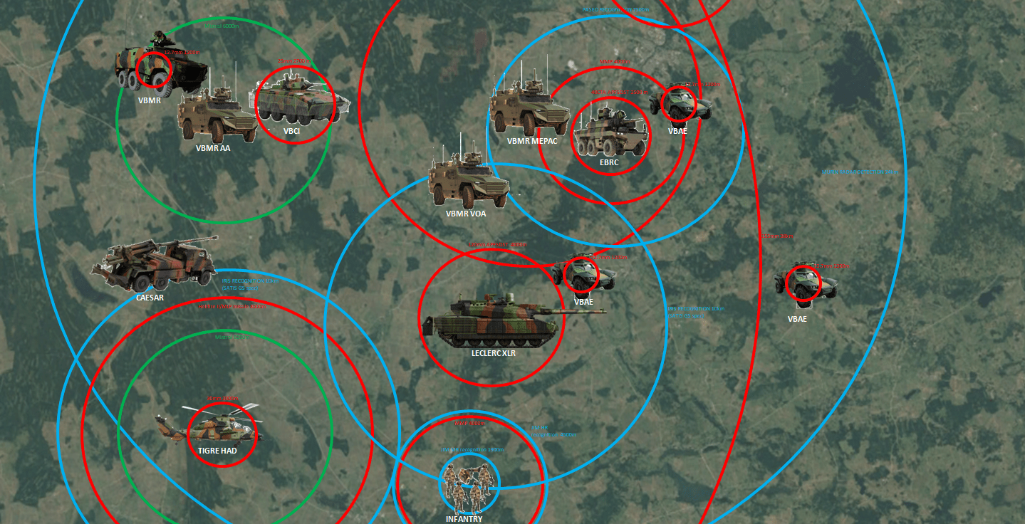Based on the publicly available information from the ministry of Defense and manufacturers’ websites, I created a map view of what an armored SCORPION force might look like on the battlefield. It shows the range of the various sensors and weapons, to scale. It is intended to help visualize how the different elements can deploy and cover each other.