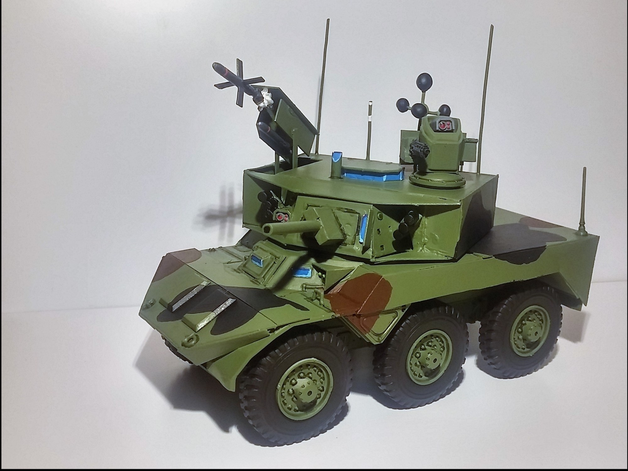 I have been building a French EBRC Jaguar wheeled recon vehicle for some time, and it’s now finished! I used a 1/35 British Armored Car Saladin Mk.2 from Dragon as a basis, and customized it with plasticard and wharhammer 40k bits so it looks more like the real deal.