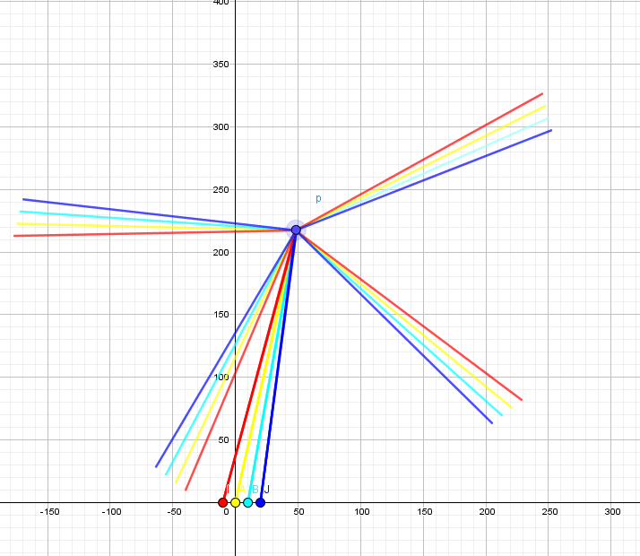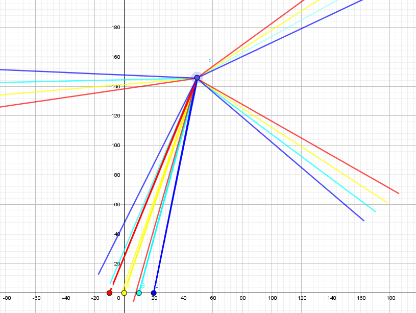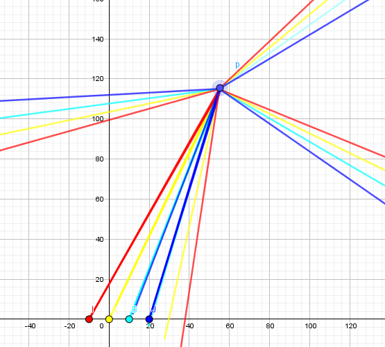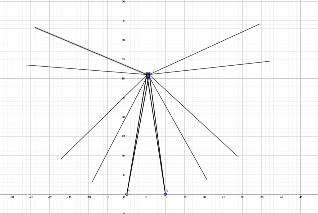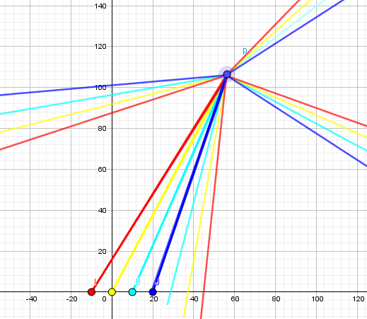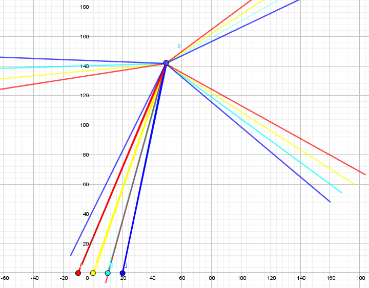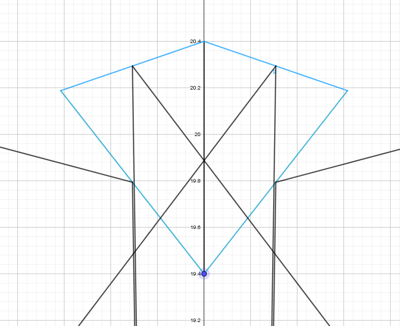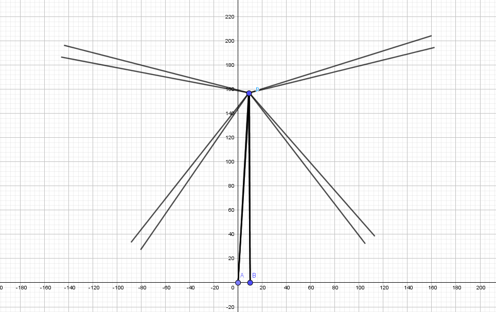 Here the radar is at the origin of the axis, and the stealth target above in blue. The 4 lines going from the stealth target are the reflections. Here is a closer look at the reflections: