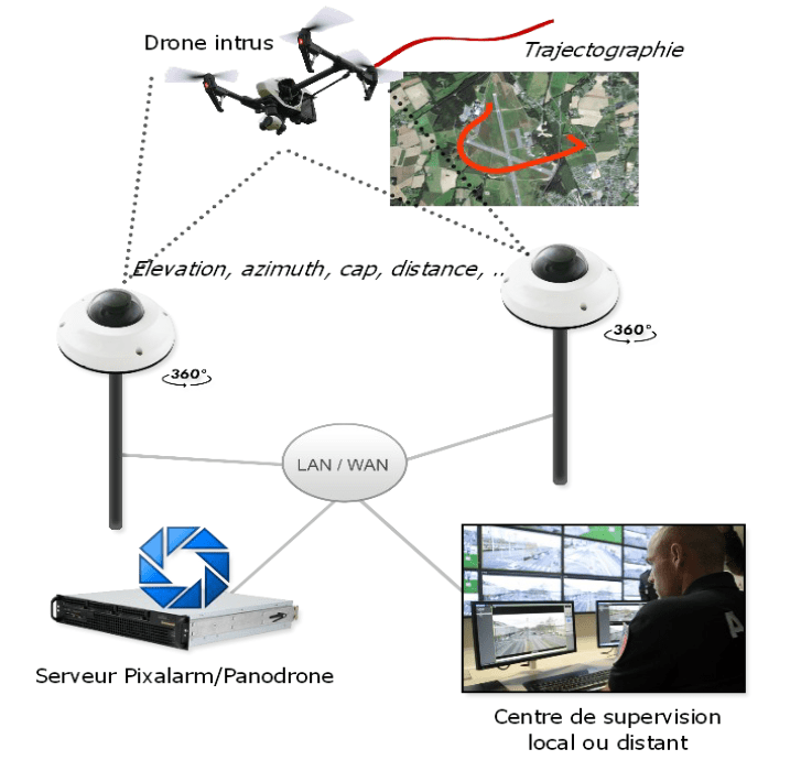 Une première famille de solutions est d’utiliser un seul capteur avec une lentille fisheye, comme les caméras plein ciel d’astronomie. Inpixal a développé un tel système appelé Panodrone: