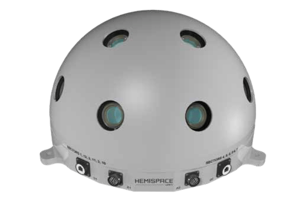 Pour dépasser ces contraintes, on peut imaginer un système avec un grand nombre d’optiques. C’est ce qu’à fait Lerity-Alcen avec Hemispace, avec le soutien de la DGA. Ce système a 12 caméras, surveillant chacune un secteur de 50° avec 40 mégapixels, avec une résolution de 20cm à 1km: