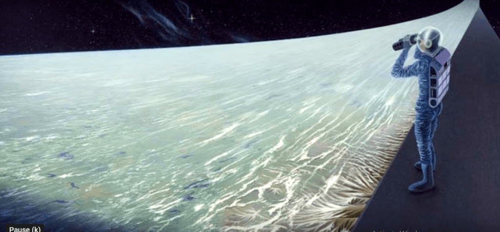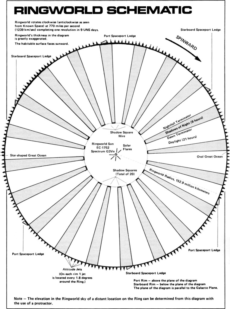 I wonder if the more practical Bishop Rings (as seen in Halo) would last long enough to allow the relatively primitive societies described above to exist. They can be built out of carbon fiber instead of scrith, but are only 1000 km across. They still use centrifugal force for gravity and don’t need to be enclosed at the top.